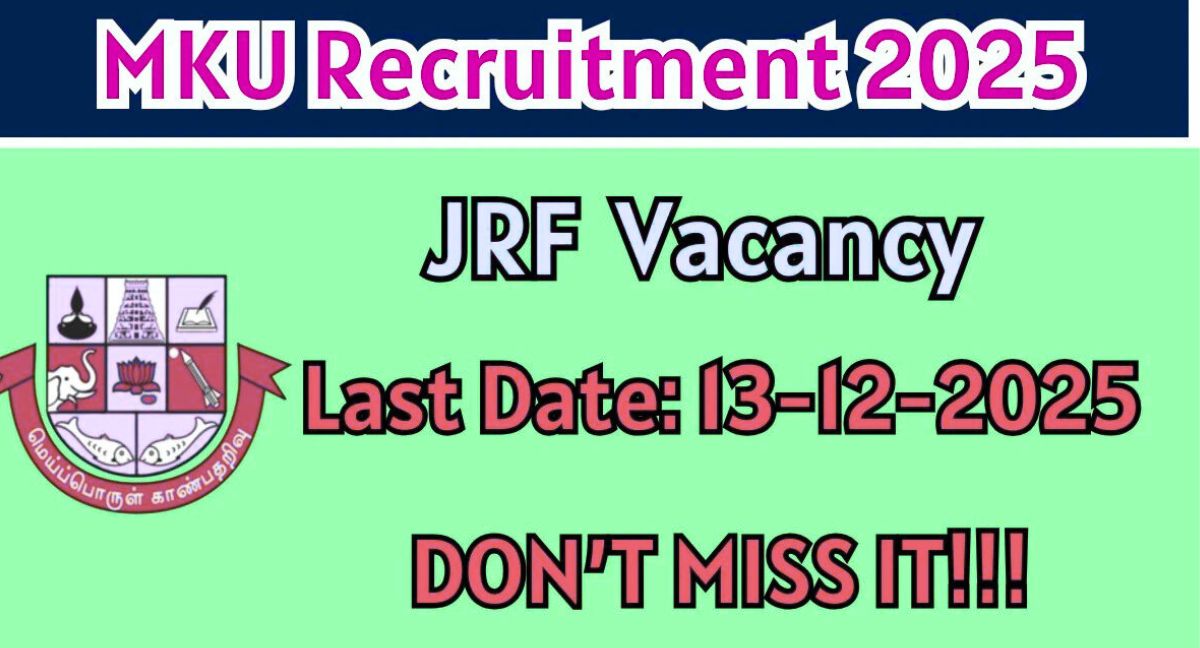MKU Junior Research Fellow Recruitment 2025 – Offline விண்ணப்பிக்கலாம் Madurai Kamaraj University (MKU) 2025 ஆம் ஆண்டிற்கான Junior Research Fellow (JRF) பணியிடத்திற்கான வேலைவாய்ப்பு அறிவிப்பை வெளியிட்டுள்ளது. மொத்தம் 1 இடம் காலியாக உள்ளது. தகுதியான المرுவர்கள் தங்களது விண்ணப்பத்தை 13-12-2025 அன்று முன் ஆஃப்லைன் முறையில் சமர்ப்பிக்கலாம். கல்வித் தகுதி, சம்பளம், தேர்வு நடைமுறை, விண்ணப்பிக்கும் விதிமுறை உள்ளிட்ட முழு தகவல்கள் கீழே வழங்கப்பட்டுள்ளன. MKU Junior Research Fellow … Read more